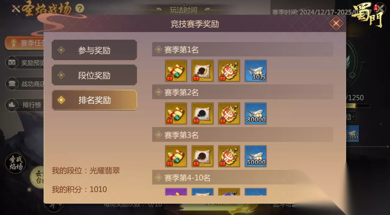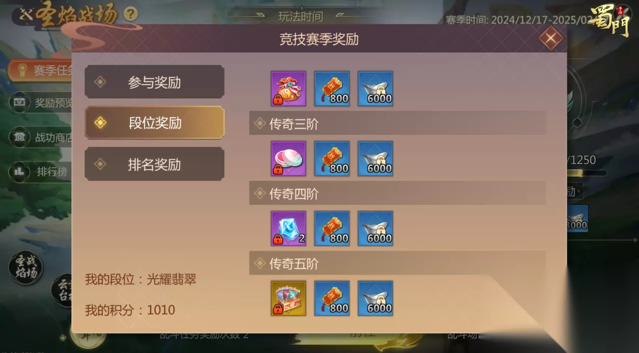 2、积分排行奖励 每个赛季还会根据赛季竞技积分获取的多少进行排名,排行靠前的蜀友可以获得海量绑银和限定称号+头像框+仙章。详细的奖励大家可以在奖励预览中查看。
