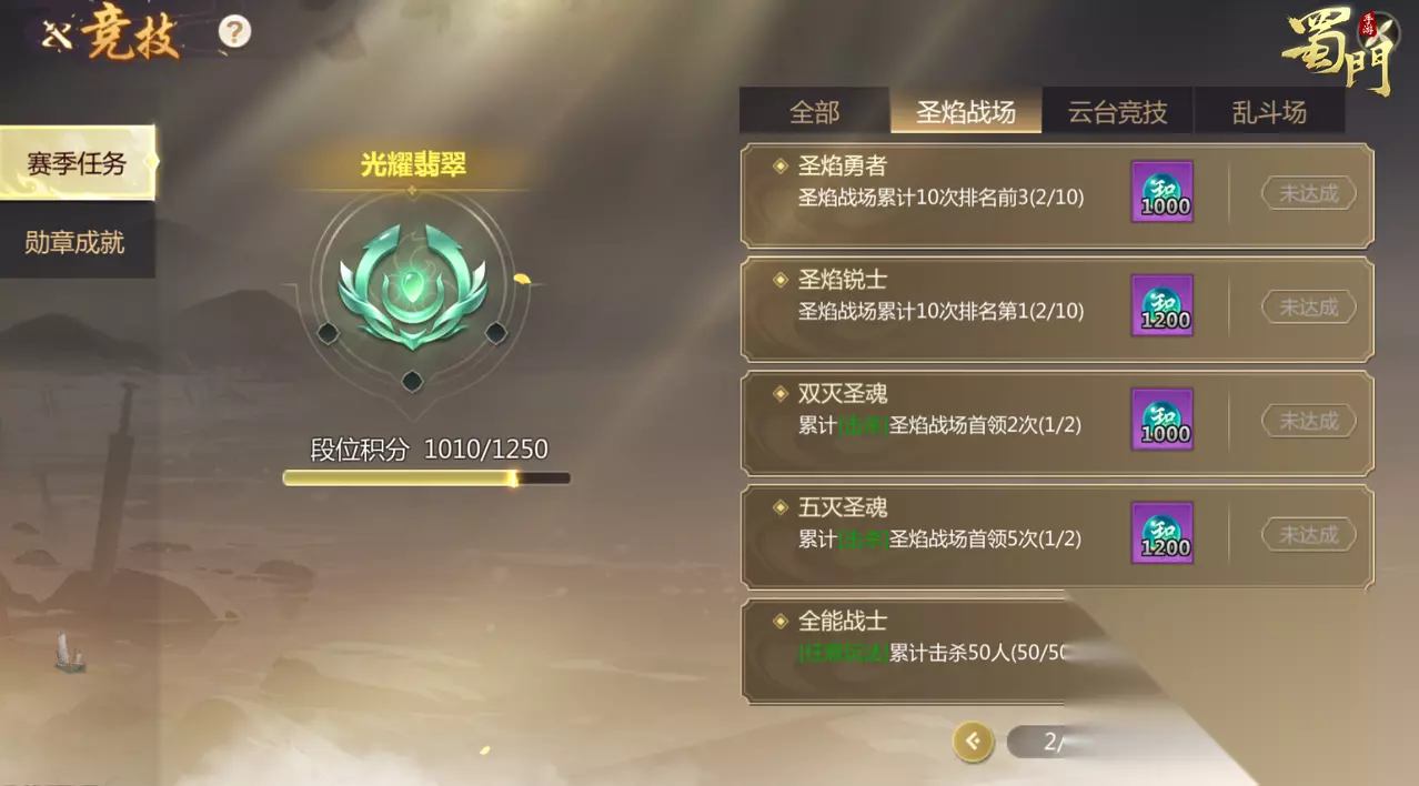 3、完成赛季任务 最后就是赛季任务了,完成各个玩法对应的赛季任务可以获得相应的竞技赛季积分,每个任务在赛季内只能完成1次,拿到1次相应的积分奖励。可以在赛季任务界面查看自己的任务完成情况。 赛季任务是有难度的,其中涉及到参与玩法次数、累计胜利场次的任务建议大家还是做完,剩下的连胜、击杀首领、排名任务则有难度,各位蜀友量力而行。