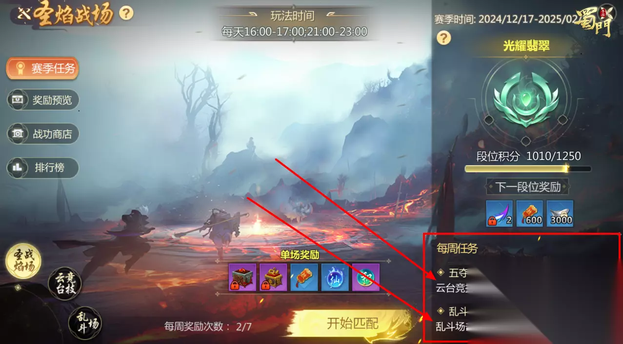 另外,乱斗场的活动积分、圣焰战场的阵营积分与竞技赛季积分不是同一种积分!打乱斗场的日常任务是不给竞技赛季积分的。 2、完成每周任务 这个任务在界面的左下角,是每周随机刷新的。大家可以看看自己的任务指引是什么,去完成相应的任务就可以获得积分了。这个任务还是比较简单,基本上打满每周的奖励次数+乱斗的日常可以顺便完成周常任务。也是每周必做满!