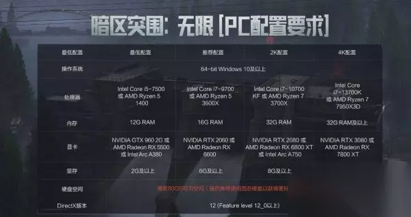 暗区突围PC端游配置要求大全2025 一、最低配置推荐 官方下载地址:点击进入 1、操作系统:64-bit Windows 10及以上 2、处理器:Intel Core i5-7500或 AMD Ryzen 51400 3、内存:12G RAM 4、显卡:NVIDIA GTX 960 2G 或AMD Radeon RX 5500或 Intel Arc A380 5、显存:2G及以上 6、硬盘空间:需要80GB可用空间(强烈推荐使用固态硬盘以获得更好的游戏体验 二、高配置推荐 1、操作系统:64-bit Windows 10及以上 2、处理器:Intel Core i7-9700或 AMD Ryzen 53600X 3、内存:16G RAM 4、显卡:NVIDIA RTX 2060 或AMD Radeon RX6600 5、显存:6G及以上 三、更多PC配置要求