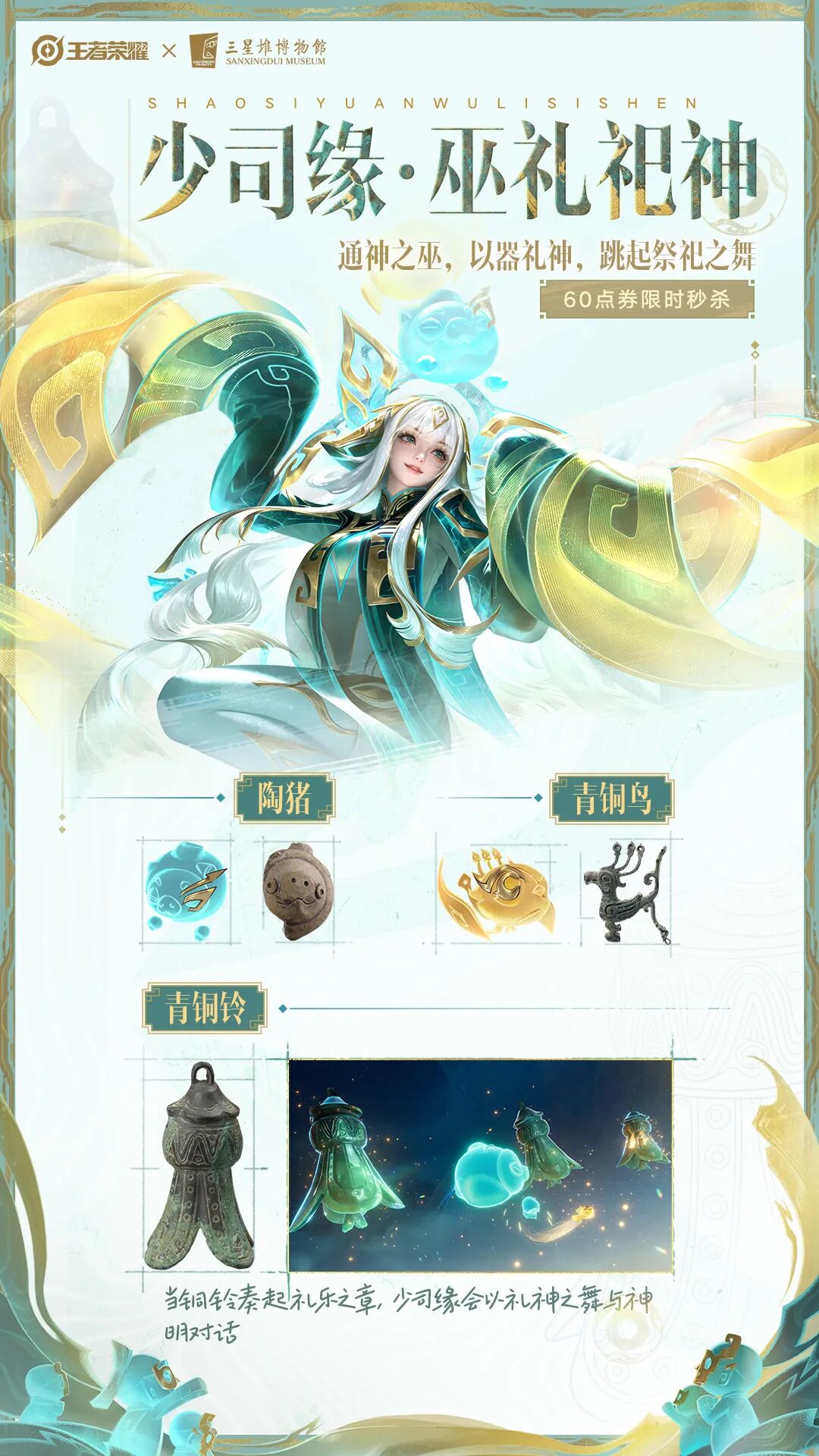 王者荣耀×三星堆博物馆,十周年携手艺术指导张艺谋,共创设计十周年限定皮肤【三星堆主题系列皮肤-寻迹三星堆】之少司缘-巫礼祀神,讲述青铜现王者,一眼见古今的宏大想象!10月25日零点开启6元限时秒杀,不要错过哦~