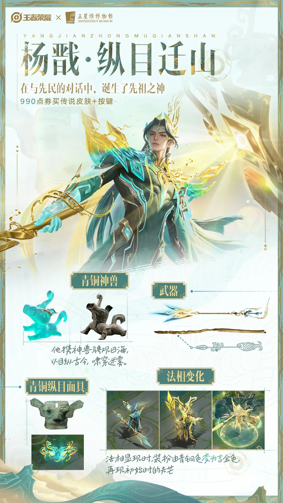 王者荣耀×三星堆博物馆,十周年携手艺术指导张艺谋,共创设计十周年限定皮肤【三星堆主题系列皮肤-寻迹三星堆】之杨戬-纵目迁山,讲述青铜现王者,一眼见古今的宏大想象!