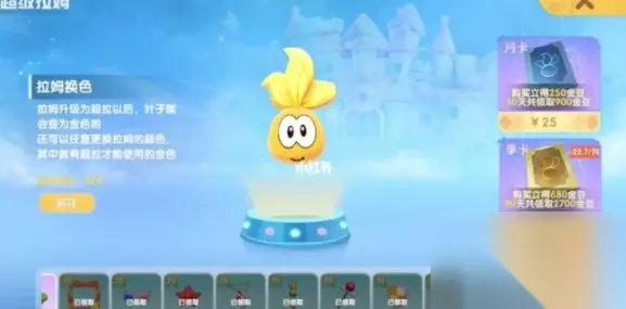 1、想要成为超级拉姆就要不断地去培养它,可以通过喂养,玩耍,悉心照料就会让拉姆成长; 2、等成长到一定值之后,玩家需要购买超拉月卡/季卡/年卡;