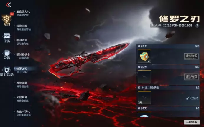 英雄级近战武器修罗之刃福利上线,***就能抱回家!活动期间只需累计登录7天,不仅能直接拿下这把英雄级近战,还能同步领取3500钻石+2枚典藏之骰——钻石能囤货换道具,典藏之骰可冲飞行棋王者之盘。每天上线签个到,就能把英雄级武器和奖励道具一起收入囊中,千万别错过这波近战福利!