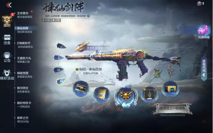 诛仙剑阵已开启最后一轮抽奖!你的9A91-诛仙四剑觉醒了吗?解锁强力专属技能“诛仙四剑”:切换剑匣分别触发命中躯干、头部、腿部、手部的伤害强化。让每一次射击都更具杀伤力,助你在战场上实力飙升!另外秦俑挂饰、秦铜盾挂饰隔一年返场,千万别错过!