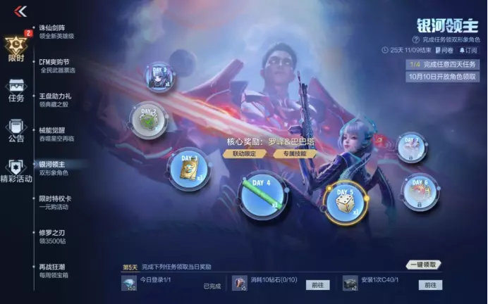 罗峰&巴巴塔也迎来返场,吞噬星空限定角色免费来拿!参与银河领主活动,只需从7日任务里任选4天完成,就能直接把罗峰&巴巴塔角色收入囊中!更值的是,角色还自带强力挑战技能:在挑战模式中能释放衍·幻剑式,向前发出9把剑刃,打怪效率直接拉满,颜值、情怀、实力全在线!