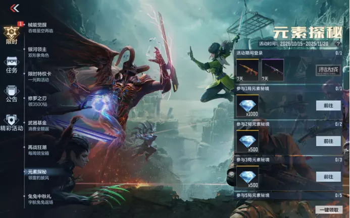 全新生化追击地图元素秘境已破晓降临,同步上线的限时活动元素探秘携多重豪礼来袭,福利领取轻松无门槛。活动期间,上线即可直接解锁HK417-朱雀(7天)与VEPR12-紫魔(7天)。只需完成1场对局,就能到手1000钻石,更有王者之骰等你来拿。参与10局元素秘境,还能解锁超炫酷的永久雷豹披风!