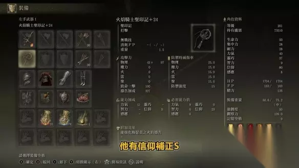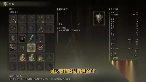 打小兵带圣战护符。 火对蝎: 纯增加火属性的攻击力。 卡利亚徽章: 减少我们战技消耗的FP。