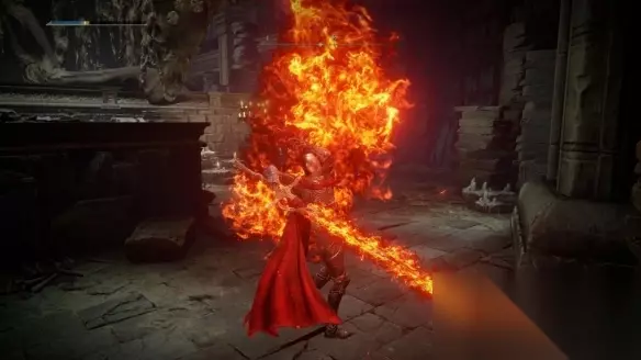 3. 下去建议马上再按电梯让电梯上去,这样刷比较快; 4. 下去的第一只火焰骑士就是了; 5. 紫色的光是铠甲或头盔; 6. 白色才有可能是武器。 流派思路 1. 可以看到这把火焰骑士大剑的介绍上面写说武器执行过火焰的祷告。 2. 所以玩家不管使用任何方法,只要附加火属性的攻击力时,这把剑就会大幅提升威力。 3. 所以它搭配火焰穿刺这个战技真的是绝配。