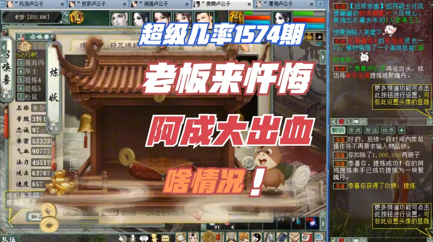 这是阿成视频大话西游2超级几率1557期内容,展示了游戏中的几率操作,玩家成功提炼出聚魄丹、开出圣兽要诀,本期分享了一位玩家账号洗出两个高级召唤兽的超级几率内容,展现大话西游2的游戏几率玩法。
