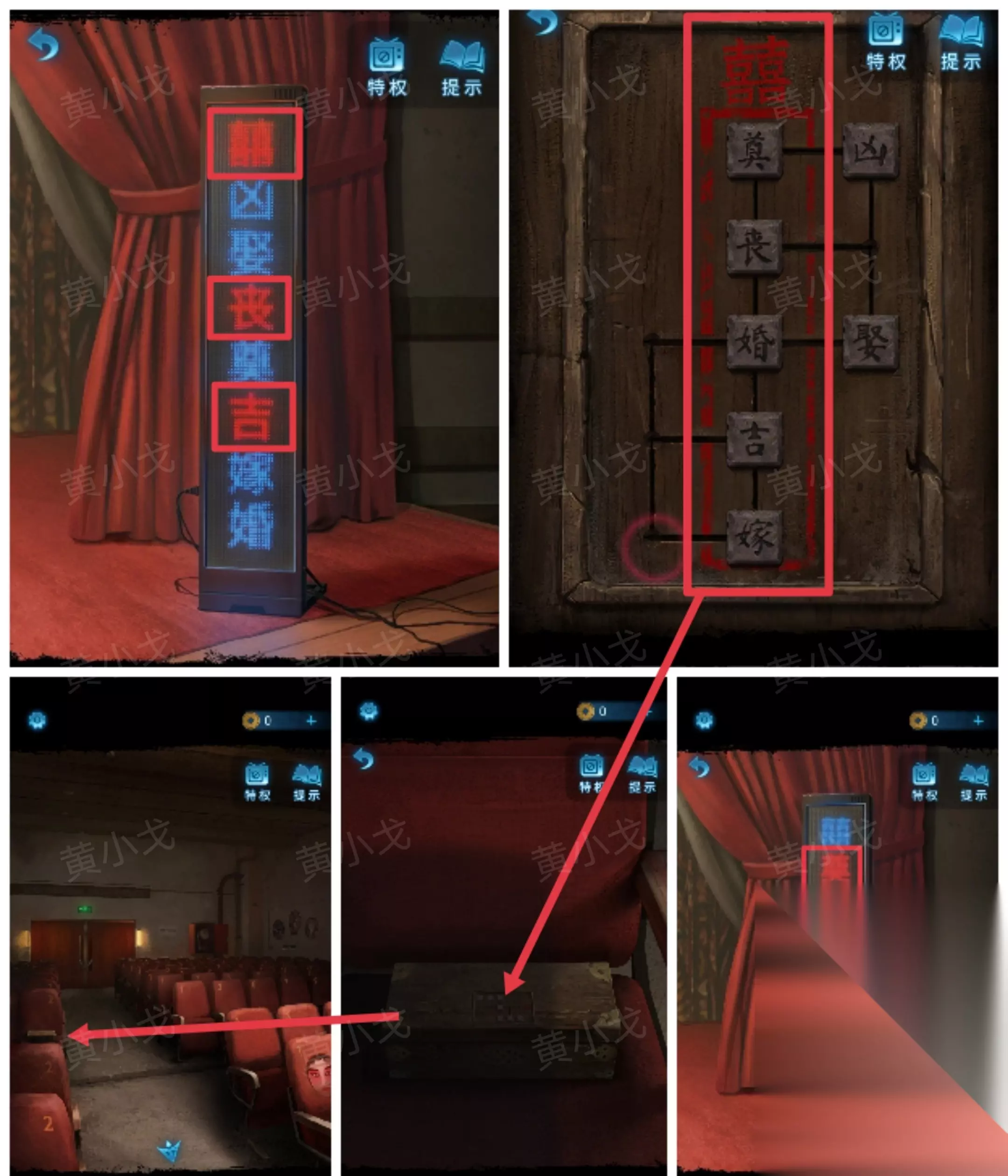 14.(观众厅)点击座椅中间的盒子,根据上面的红色囍字和红色框,结合屏幕上的文字线索,调整滑块至正确的位置(囍奠丧婚吉嫁)(红色囍字和红色框,说明红色框里取红字。顺序是按照两个屏幕上红字的高低位置排序)