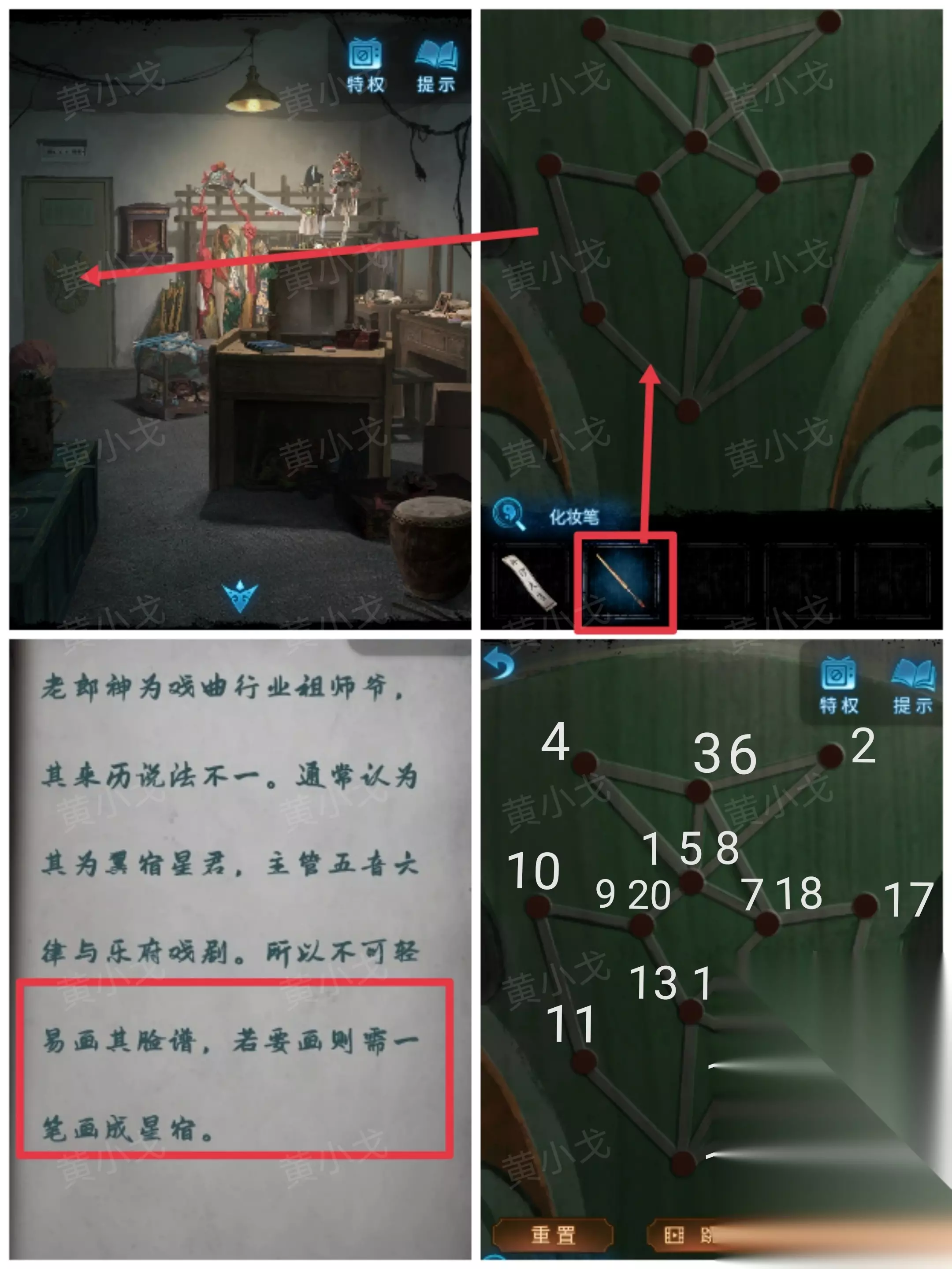 19.点击门上的脸谱,使用【化妆笔】。根据《戏曲文化戏谈》上的线索,完成一笔连线小游戏。打开门,进入仓库