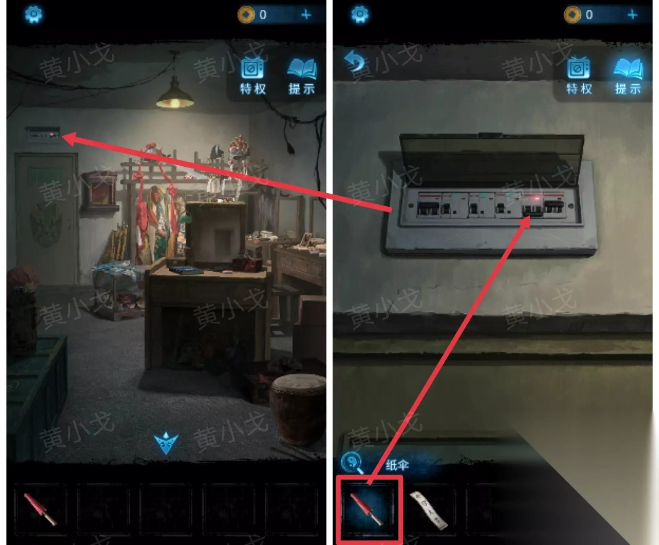 12.(后台)点击门上的电闸,用【纸伞】把电闸打上去,通电