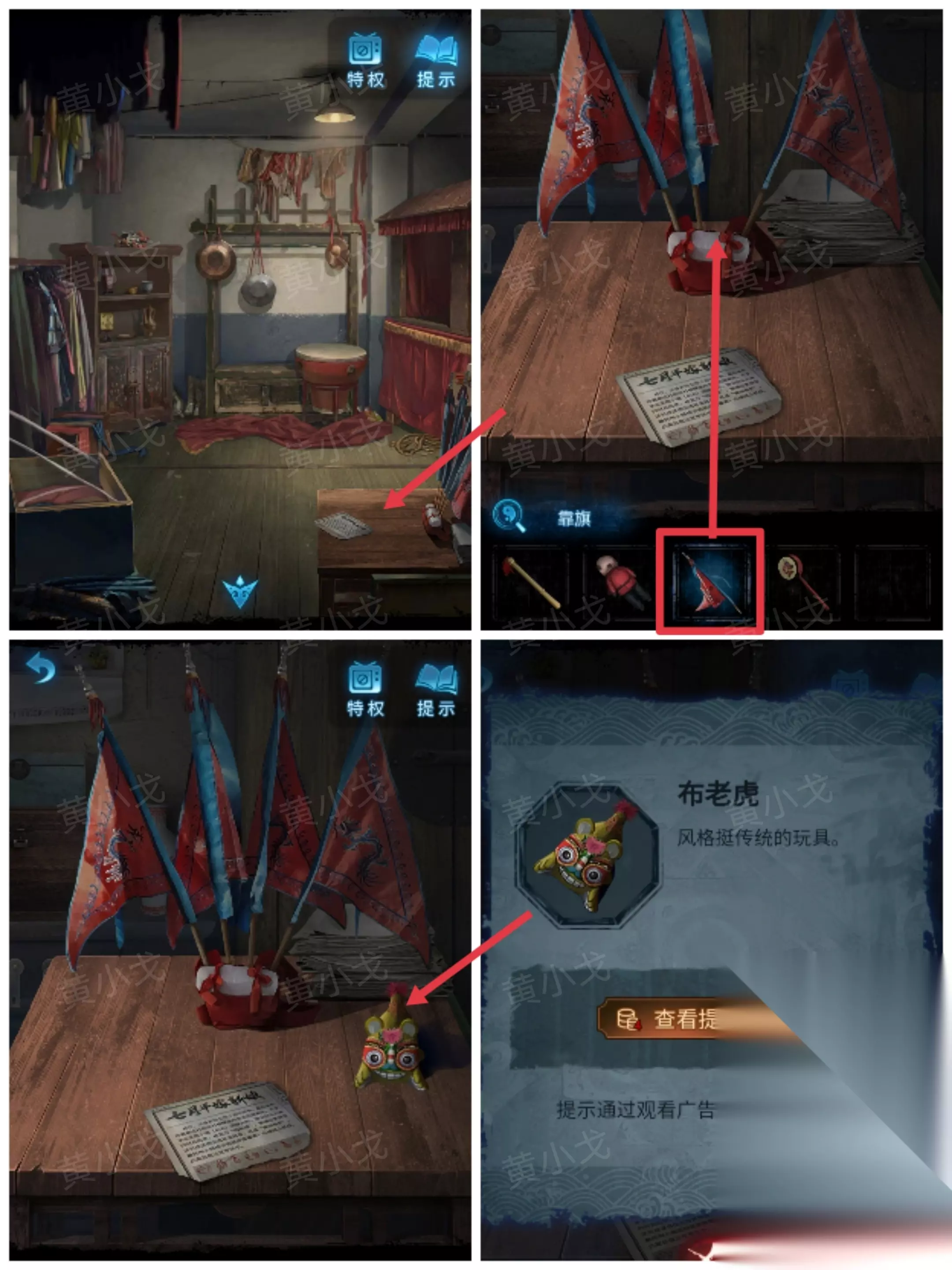 28.(仓库)点击桌子,插入【靠旗】,【布老虎】掉落,点击拾取