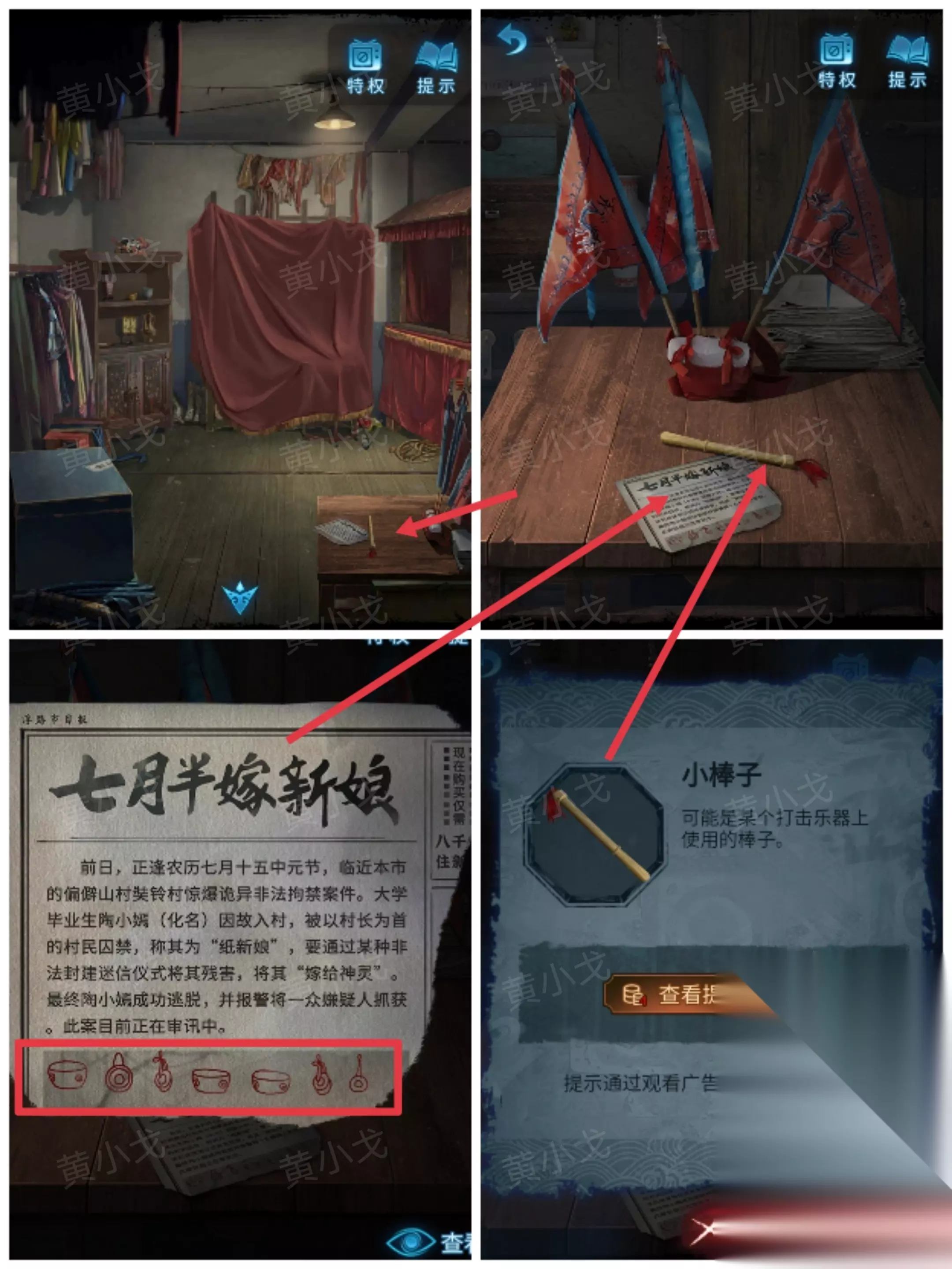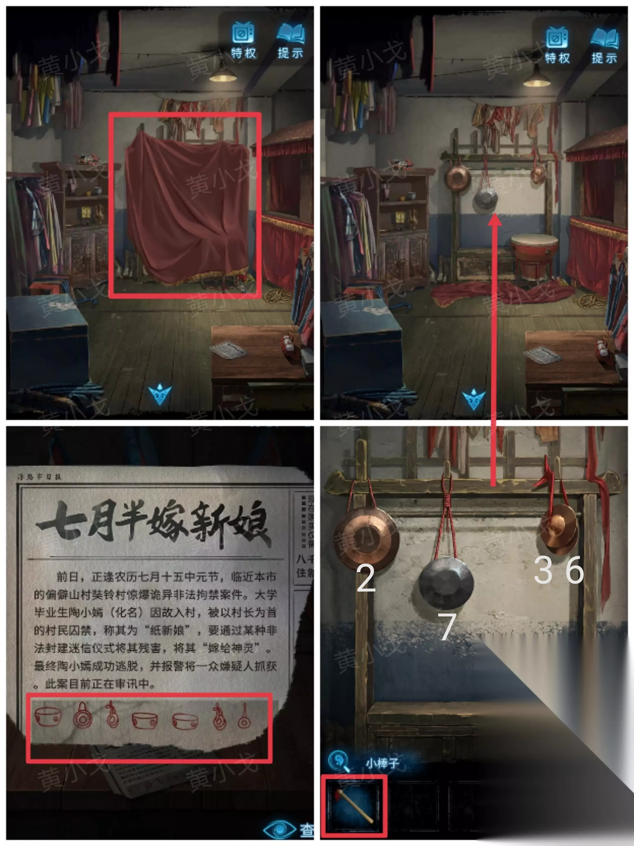 22.拉开红布,点击架子上的乐器,根据报纸上的线索,用【小棒子】按顺序敲响乐器(鼓、锣、钹、鼓、鼓、钹、银色的)(此步骤依据《戏曲文化戏谈》)