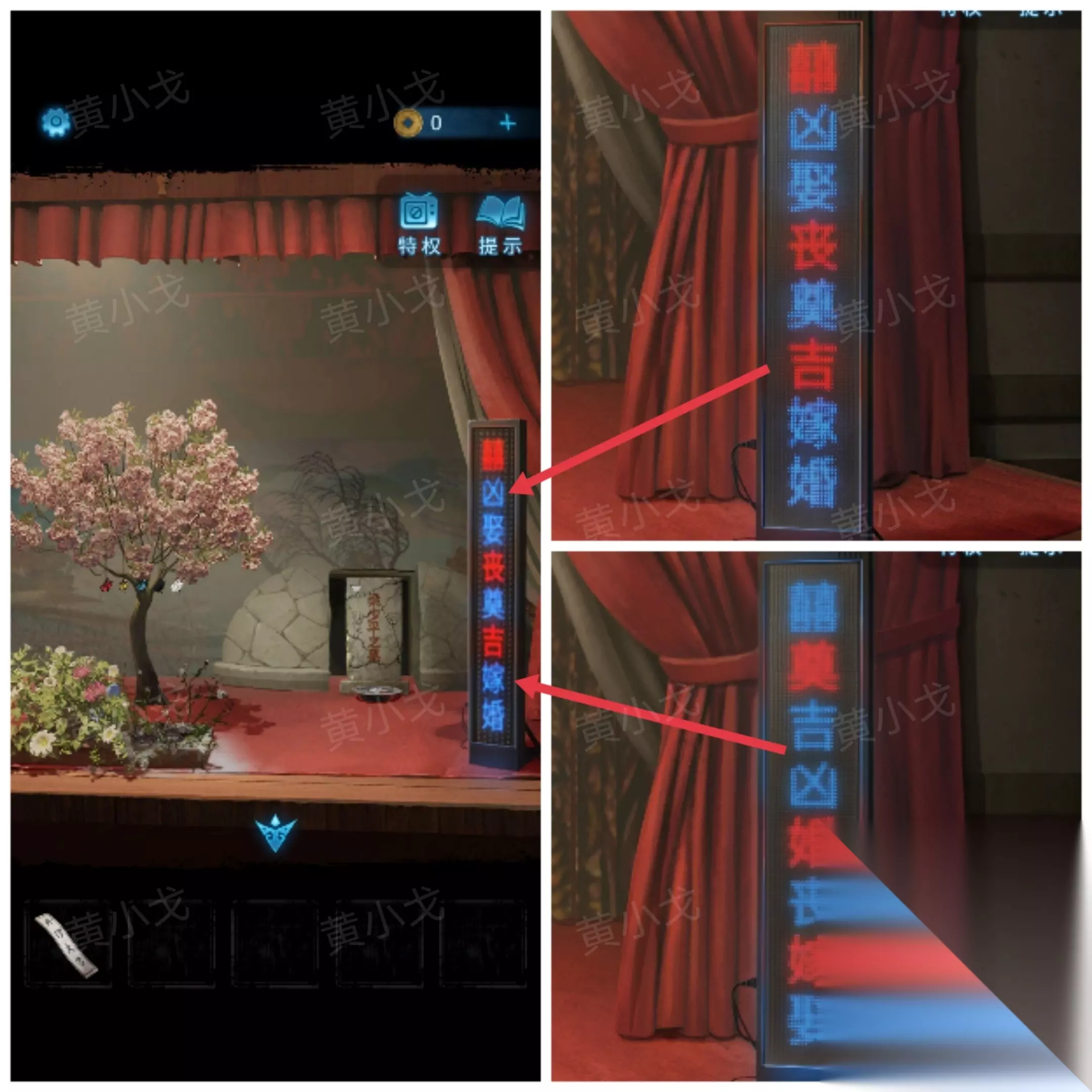 13.(戏台)点击屏幕,获得线索( 13-1.红-囍、蓝-凶、蓝-娶、红-丧、蓝-奠、红-吉、蓝-嫁、蓝-婚 13-2.蓝-囍、红-奠、蓝-吉、蓝-凶、红-婚、蓝-丧、红-嫁、蓝-娶)