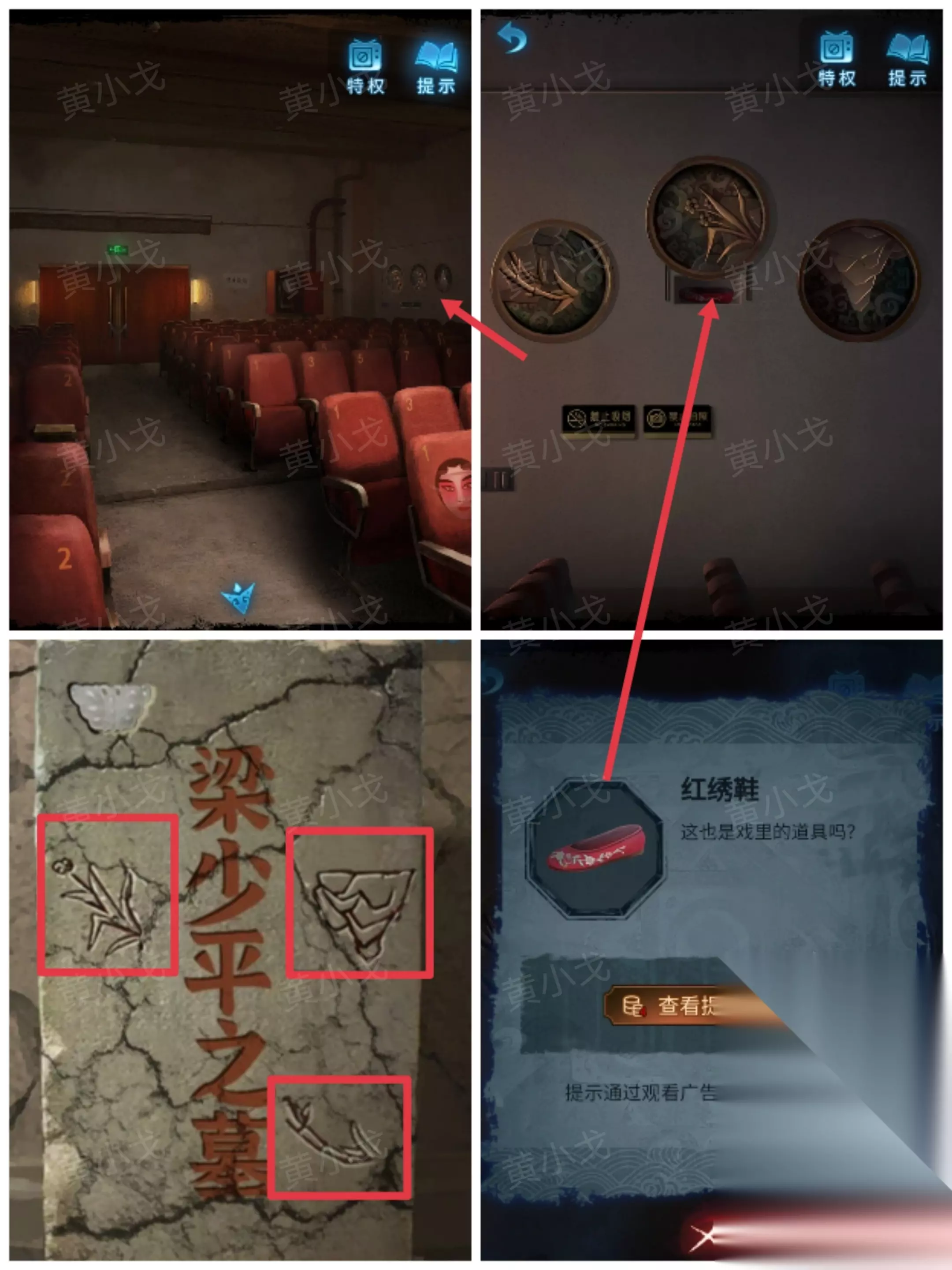 10.(观众厅)点击右边墙上的机关,根据墓碑上的线索,调整图案到正确的位置。暗格打开,获得【红绣鞋】