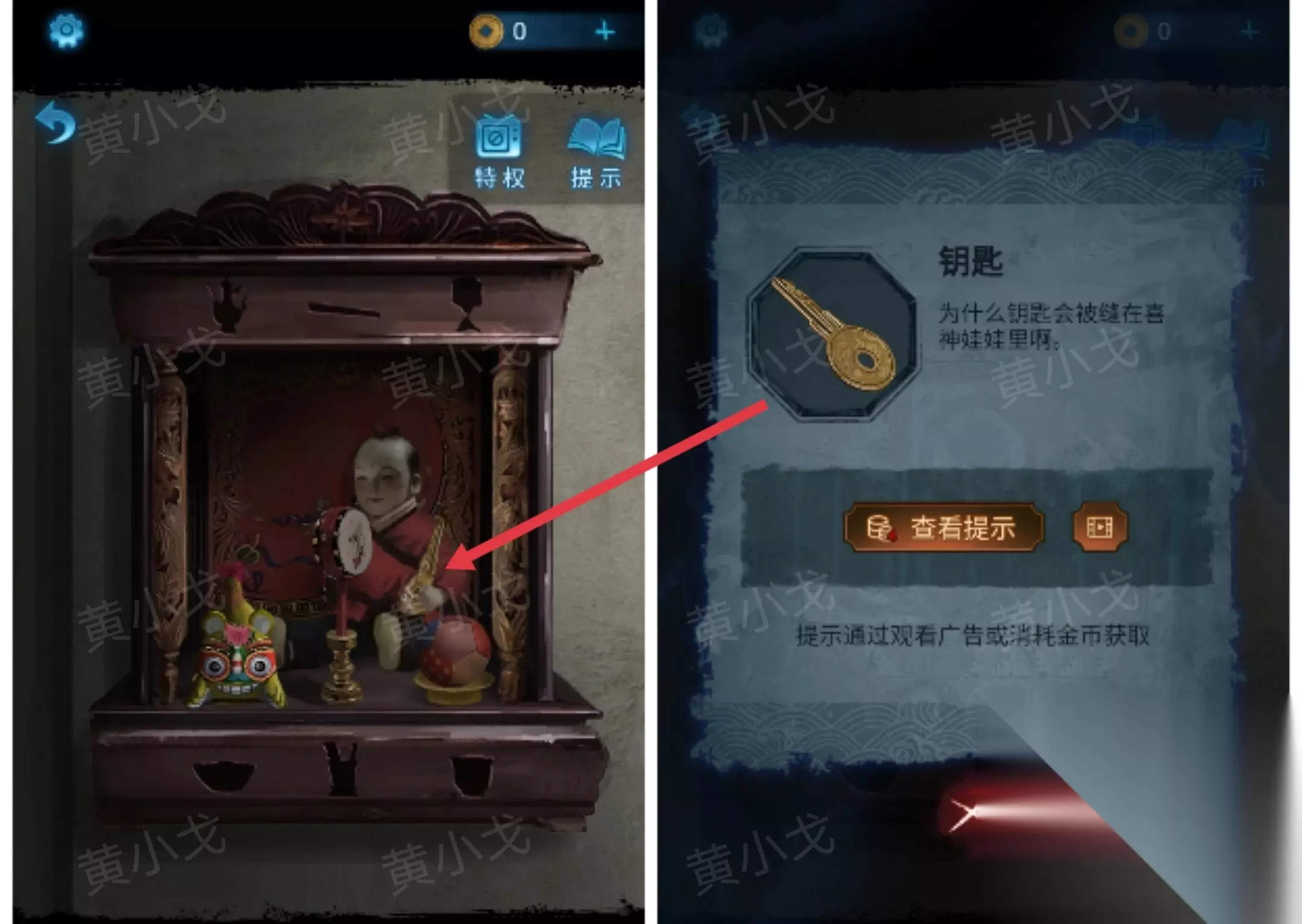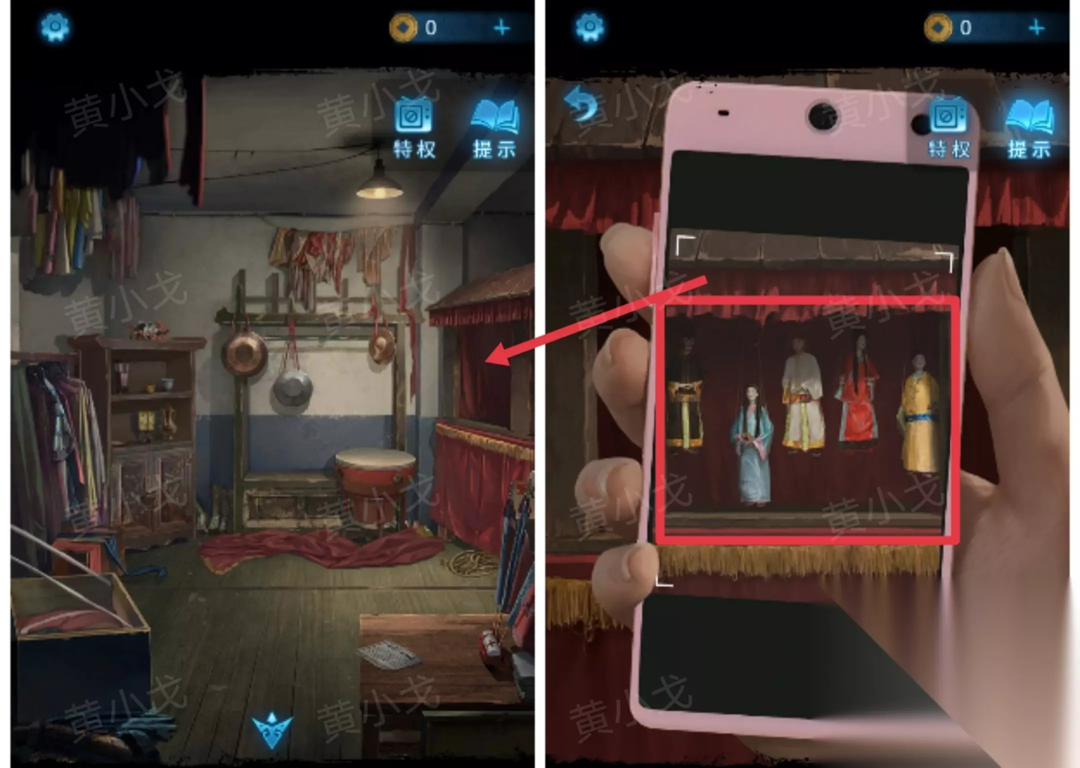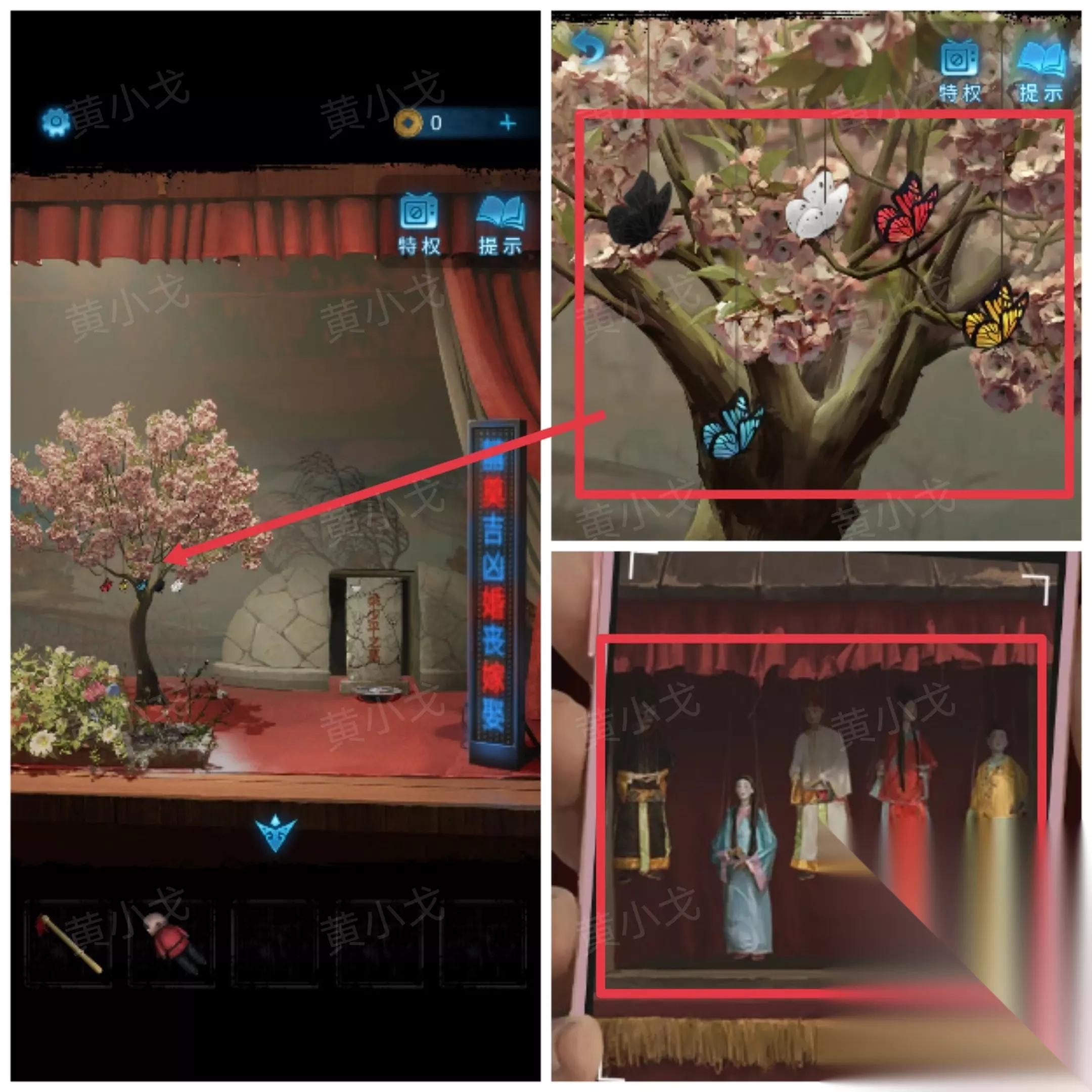 24.先去后台触发剧情再回来。点击小戏台,获得线索(注意木偶的戏服颜色和位置)