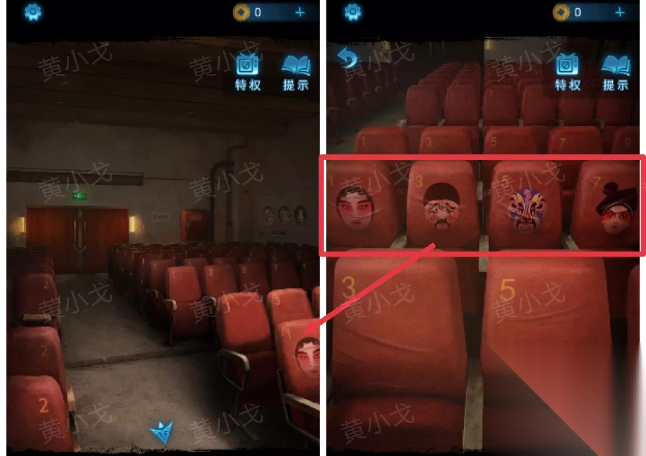 3.(观众厅)点击查看右边座椅上的脸谱图案及座位号