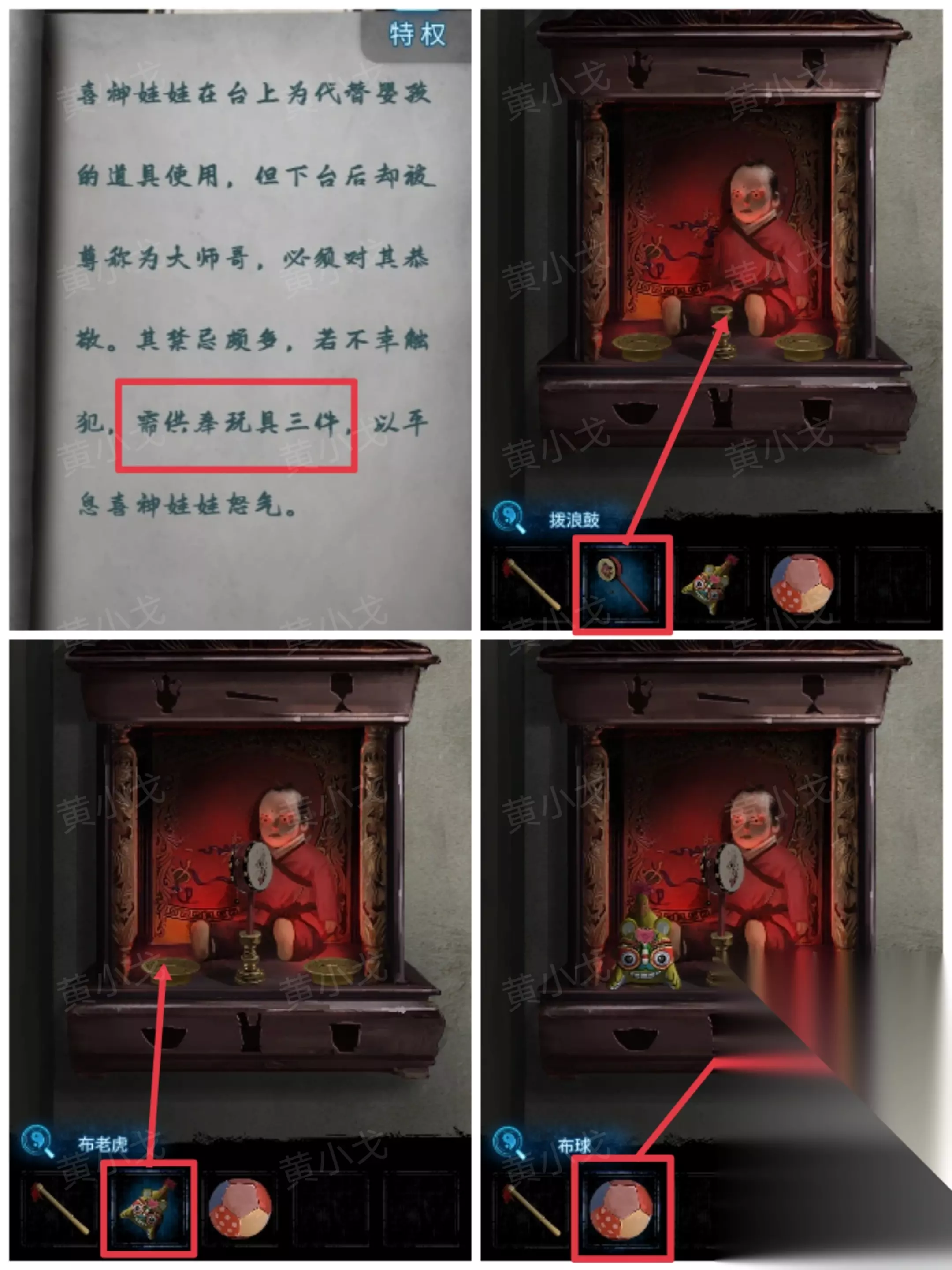 30.(后台)点击神龛,根据《戏曲文化戏谈》上的线索,放上【拨浪鼓】、【布老虎】和【布球】