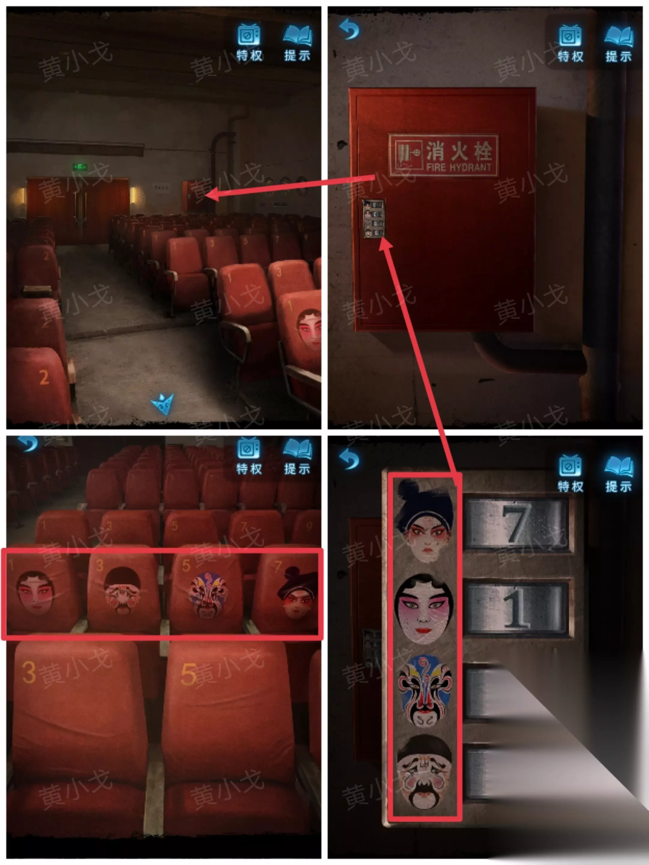 4.点击消防栓,根据上面的脸谱图案,结合座椅上的脸谱图案及座位号,输入密码:7153