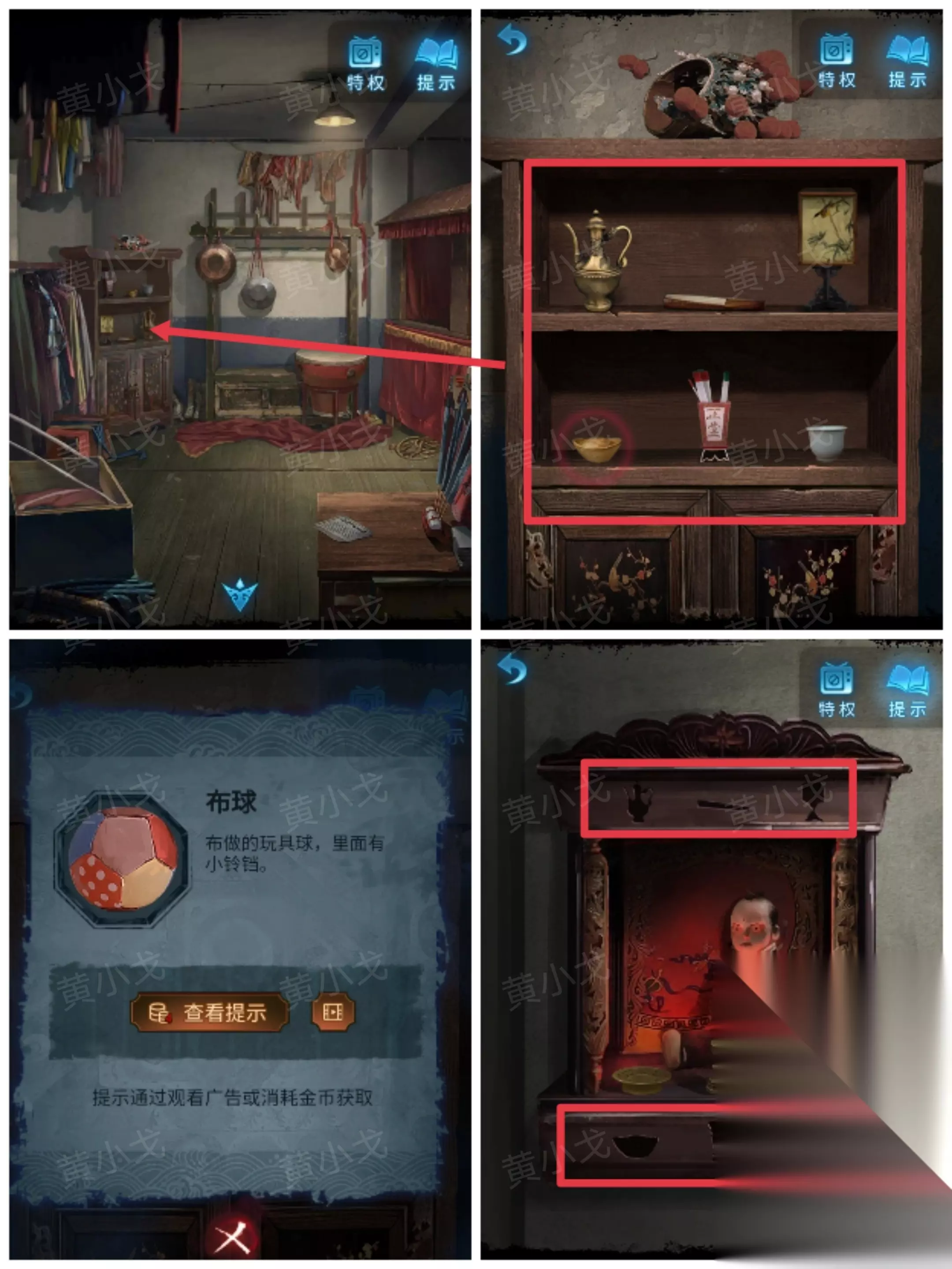 29.点击柜子,根据神龛上的图案位置,调整物品至正确的位置(上:酒杯、扇子、灯,下:元宝、签筒、杯子)。物品掉落,获得【布球】