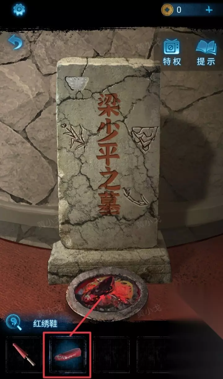 11.(戏台)点击墓碑,把【红绣鞋】扔进火盆。触发机关,暗门出现,进入暗门