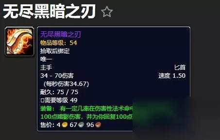 无尽黑暗之刃是玛拉顿公主掉落的武器,仅需49级就能装备,无论是等级还是属性上都不算极品装备,更何况完全不加任何固定属性,然而仅仅是一条绿字特效——命中后有一定几率回蓝就足够成为法师的神器。