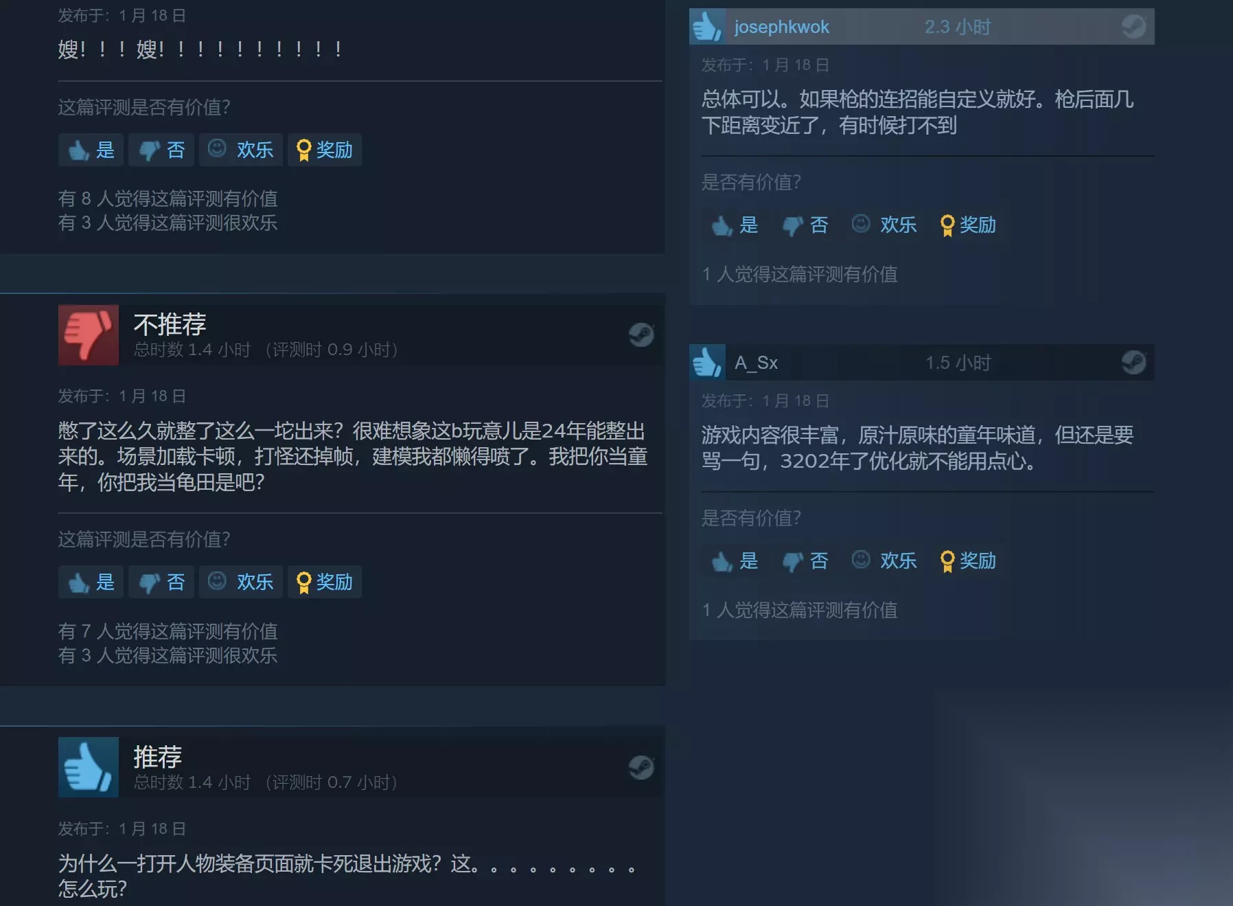 Steam玩家吐槽点部分总结: 优化问题,包括场景卡顿,打怪掉帧等 各种技术问题,包括频繁读条而且时间不短,场景分辨率低,人物建模不行,角色会跟Boss模型重叠,动作僵硬 三种武器只能按顺序一次一次的点TAB切换,操作有点“反人类”