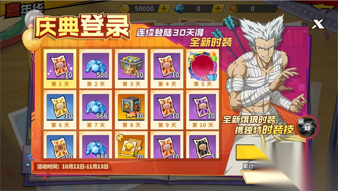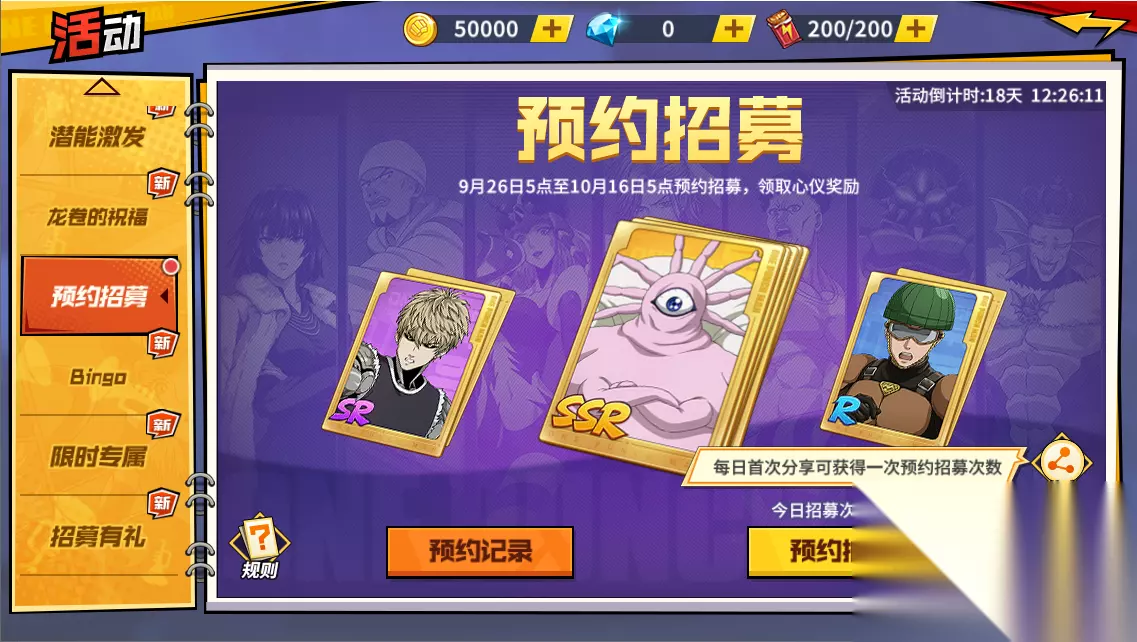 活动时间:10月12日05:00 - 11月14日05:00 大奖预览: ①UR饿狼时装,激活6张照片还可为UR饿狼激活全新时装技能 ②庆典专属头像框、形象框 ③第三季出场英雄SSR+觉醒石任选箱,可选饿狼、童帝、原子武士、超合金黑光 ④泳装龙卷聊天气泡框 ⑤海量钻石,限时招募券x10、专属招募券x5…… 四、祈福签到,登录即送埼玉西装永久形象卡 活动时间:9月26日05:00 - 10月13日05:00 大奖预览: ①埼玉西装永久形象卡 ②限时招募券x20、专属招募券x10 ③海量钻石、SSR进化石、卓越招募券…… 五、预约招募开启,助您入手第三季人气英雄