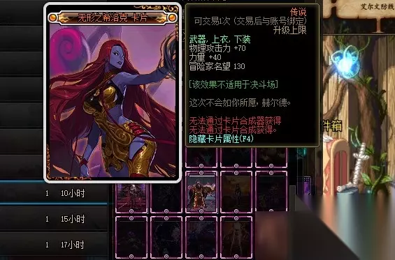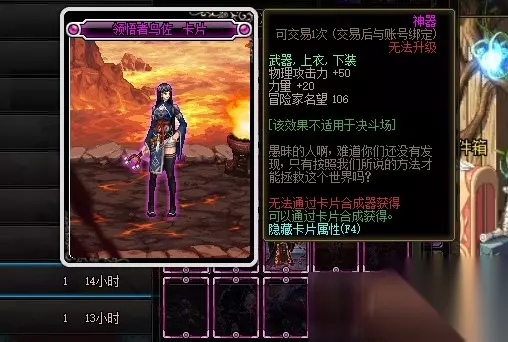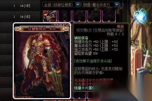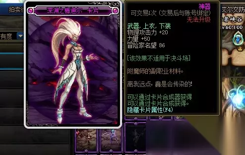 深渊之梅迪尔卡片的附魔部位是武器、上衣和下装,附魔属性是物理攻击力增加20点和力量增加50点。