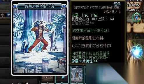 野兽师鲁乌格卡片的附魔属性是增加14点物理攻击力,附魔部位是武器、上衣和下装。