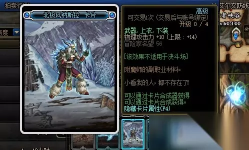 北极风纳斯拉卡片的附魔属性是增加14点物理攻击力,附魔部位是武器、上衣和下装。
