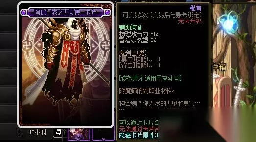 阿伽门农之力天使卡片的附魔属性是增加12点物理攻击力、[背击]和[暴击]技能等级加1,附魔部位是辅助装备。