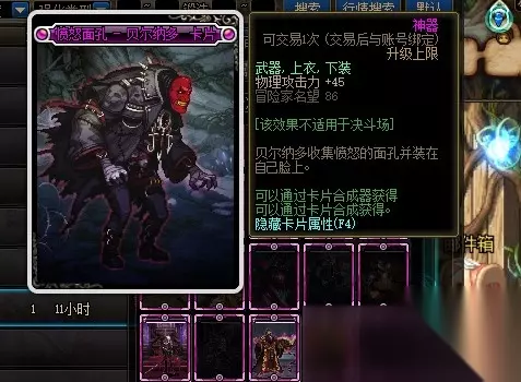 愤怒面孔-贝尔纳多卡片的附魔部位是武器、上衣和下装,附魔属性是增加45点物理攻击力。