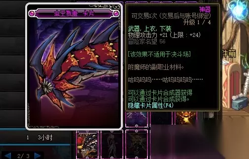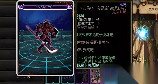 : 影子术士卡片的附魔属性是增加7点物理攻击力,附魔部位是武器、上衣和下装。
