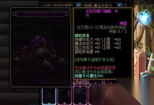 记忆印记刀疤鼠卡片的附魔部位是辅助装备,附魔属性是增加60点三攻,其中包括物理攻击力属性。