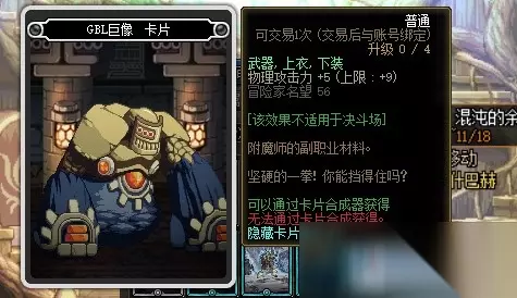 GBL巨像卡片的附魔属性是增加9点物理攻击力,附魔部位是武器、上衣和下装。