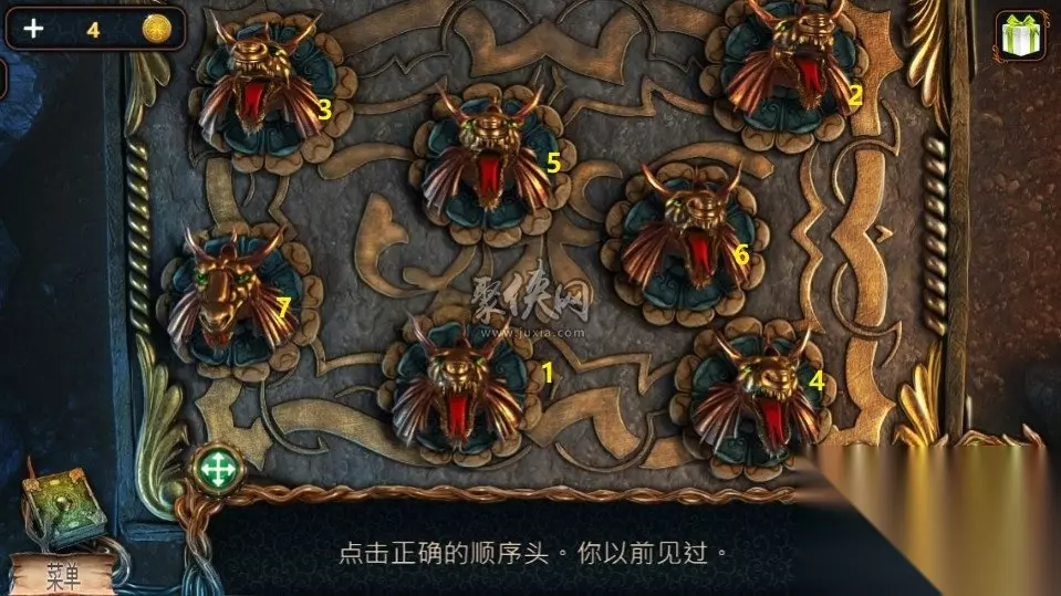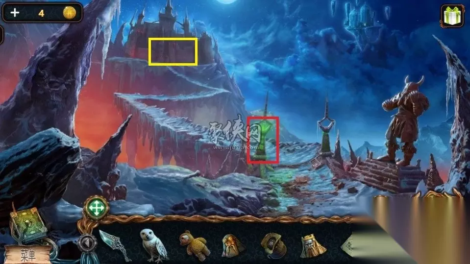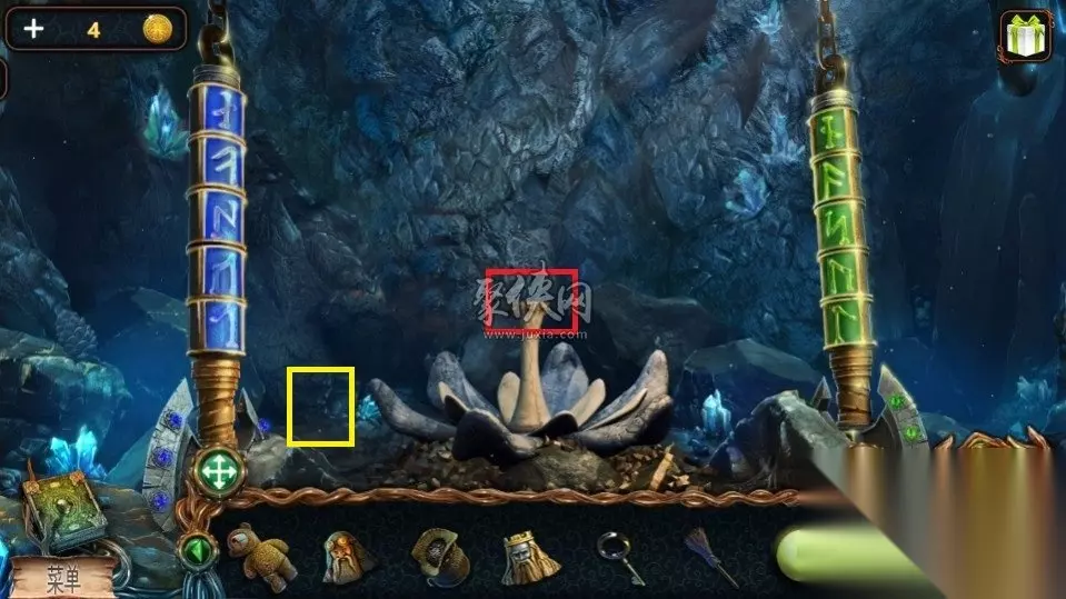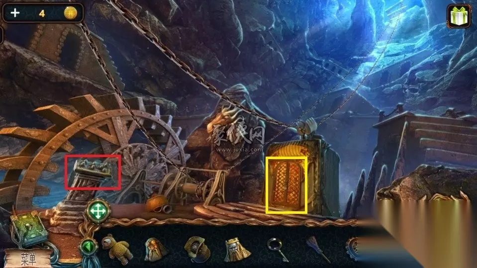 72、在山神这里,红色方框这里点击之后把珠宝放进去,这时在墙上就会出现一个人脸,点击人脸之后可以进入一段剧情,在剧情结束之后点击黄色方框处可以获得一个齿轮。