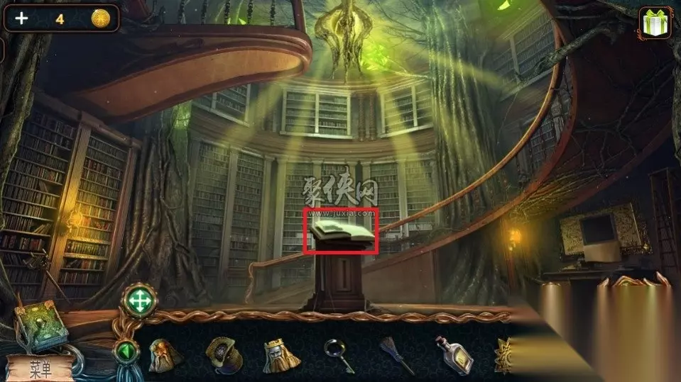 4迷失森林图文攻略第九部分,本作是全系列中最且广受好评的优秀作品之一,整个游戏不乱,适中,同时设置合理,可以说是解谜粉丝们必玩的一款佳作。 攻略流程 71、来到图书馆中,点击红色方框处放大,将溶剂对着书上有污渍的地方使用,在清理完之后点击记录出现的提示,然后点击顶部的黄色方框处并将奖章放进去,就可以获得珠宝了。