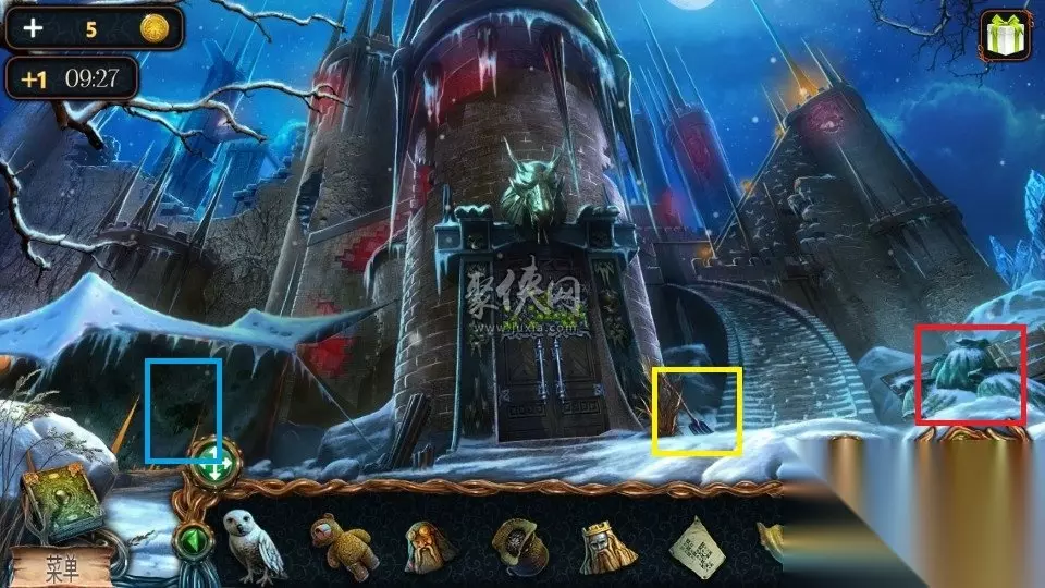 78、再来到城堡的门口之后,点击红色方框将其放大,然后去点击铜钱堆就可以获得铜钱了,在黄框处可以获得一把处铲子,点击左边蓝色框之后打开帐篷可以进入一个小游戏。