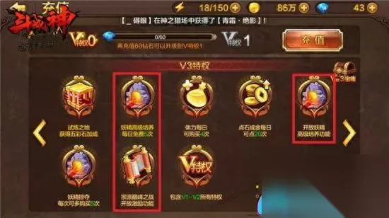 V2并无突破之处,因此我们直接转向V3。V3特权中新增了妖精的高级培养功能,每天可免费使用该功能5次,以提升妖精等级。此外,在宗派的巅峰之战中,开放了激励功能,与V1的鼓舞效果相同,皆需消耗钻石以提升攻击力。