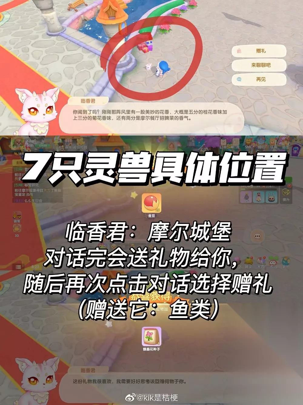 可以重复点击!直到没有礼品! 活动页面(么么生日卡片,点击左右两侧的花坛可获得2次祝福币*5!记得哦!) 活动界面(么么公主生日会,超啦可以直接领取20个祝福币+5个幸运币) 祝福币可以在摩尔城堡紫树下许愿,隔天5点后去领取礼物。 7只神兽具体位置及喜好: 临香君:摩尔城堡 喜欢鱼类,赠送任意鱼类给它