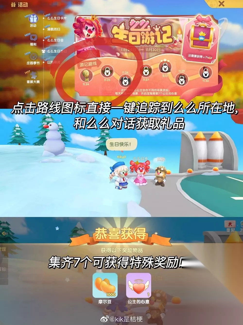 对话可获得一次礼品,赠礼后可以再一次获得礼品每只神兽有两次礼品 么么公主游记: 活动界面找到对应路线图,可直接一键追踪到么么所在地,和么么对话获取礼品,集齐7个可获得特殊奖励哦