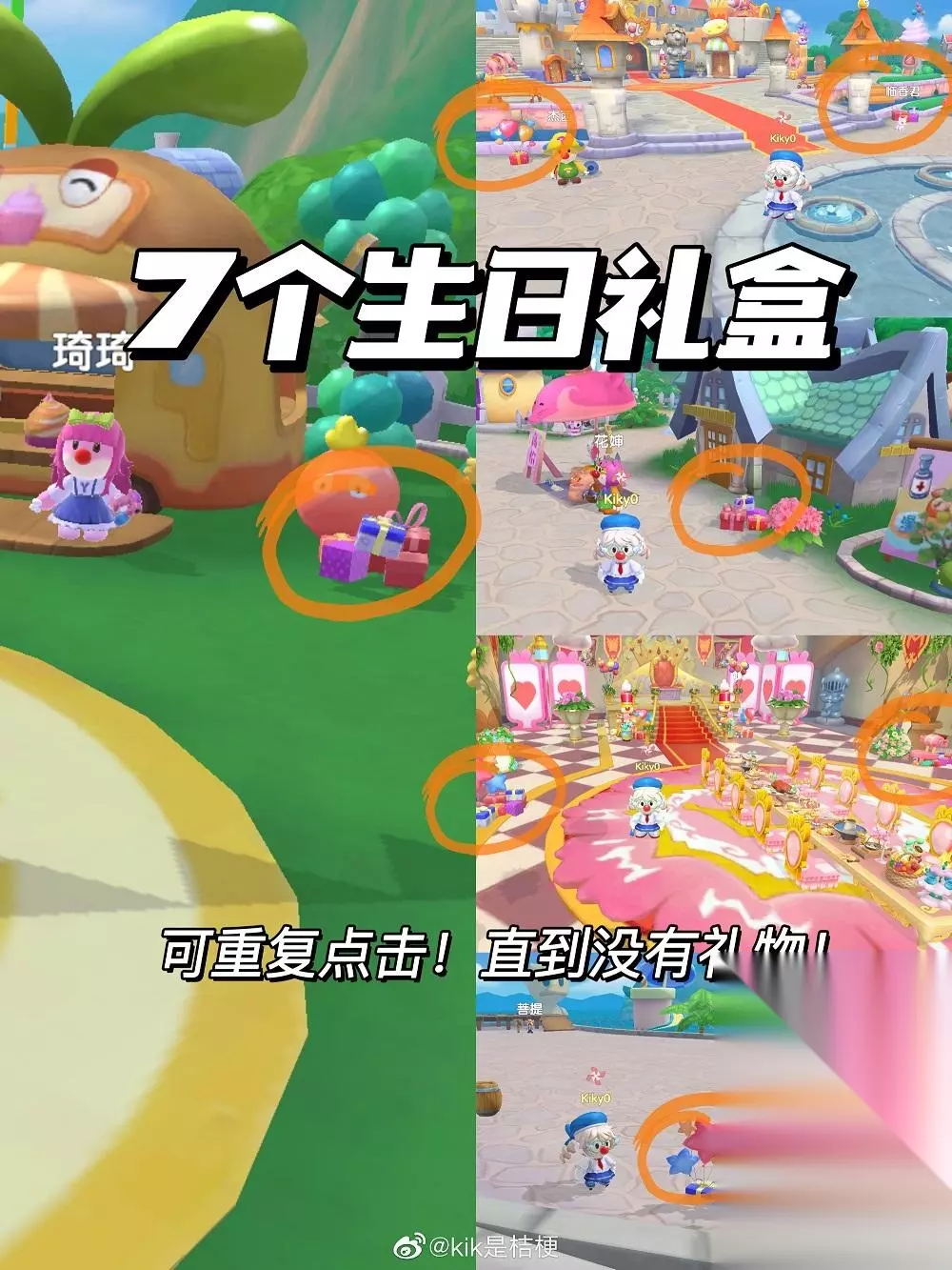 7个生日礼盒具体位置: 城堡内部2个,左右两侧 城堡外面2个,左右两侧 摩尔城堡花婶边上1个 琦琦边上1个 神秘湖左侧1个