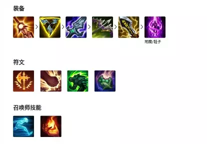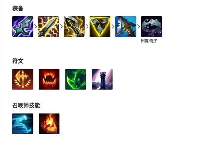 4、出装推荐四:破败、电刀、无尽、三项、怨恨、水银。 符文:征服者、猎人吸血、猎人泰坦、战略家。