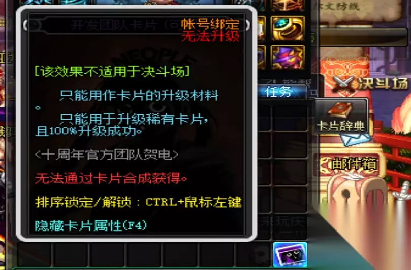 首先我们要注意就是这次十周年活动策划送的纪念卡片,这个卡片已经标注了用于升级稀有卡片的话是100%成功的,同理,之前的一些活动送的纪念卡片也拥有同样的效果。这个非常重要,因为经过之前一波策划暗改卡片升级几率之后,卡片的升级几率就变得特别坑,这个能为我们省下很多金币。