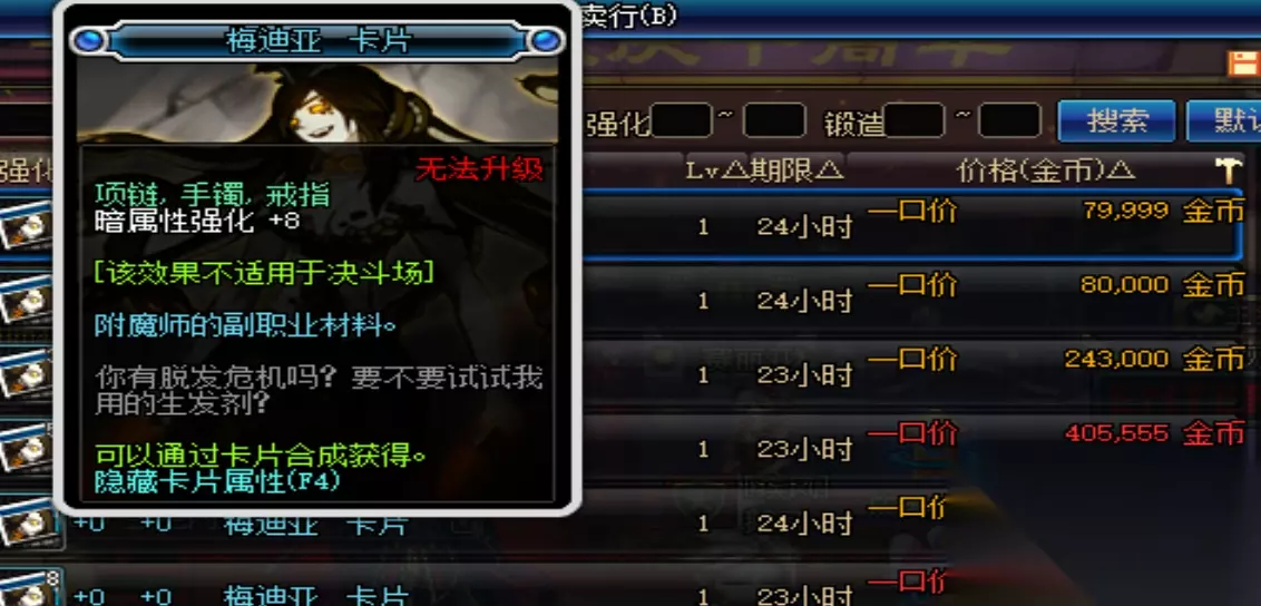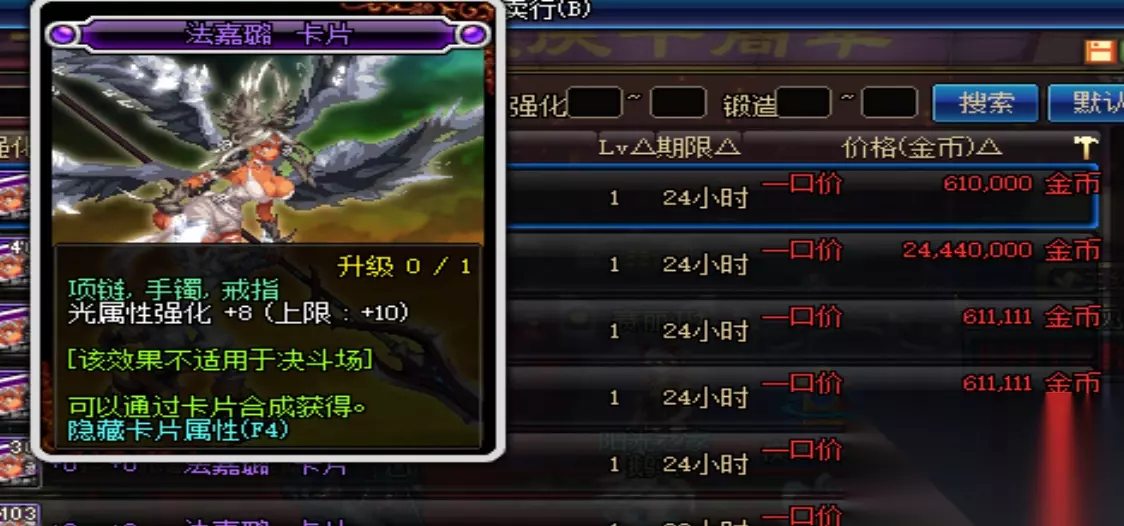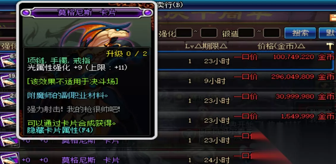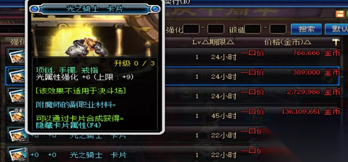 说到光强卡片首推的当然就是光之骑士了,38w一张,升级之后拥有9点光强,而用不值钱的蓝卡升级成本极低,算了一下大概是45w=9光强。其次就是法嘉年璐了用纪念卡片升级的话成本大概就是61w=10光强,而不用纪念卡片则要80w以上。最不推荐的就是这张莫格尼斯,未升级前售价就高达150w升级费用更是可怕,仅仅为了一两点光强,实在是不值得。