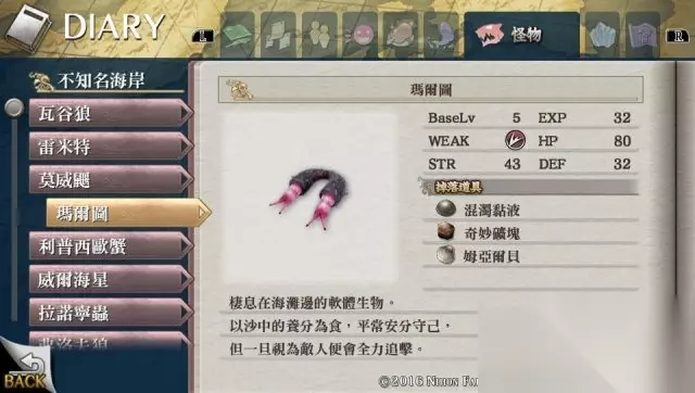 此时人物笔记相关均是剧情所属,不会漏掉,不必担心,按照流程速通即可。 «12345678910»友情提示:支持键盘左右键"←""→"翻页 第二章:漂流者的狂宴 剧情后出门寻找多奇和大叔对话,之后到海滩进行钓鱼,再返回村内开始料理系统,(钓鱼我会在最后统一给出鱼出现的地方,不存在可以漏过的鱼类请放心,料理则是随着攻略慢慢给出,最后列表。) 这时候可以升级武器了,把任意一个武器升级到LV MAX 可以获得奖杯 いっぱしの��化�人 现在开启了支线任务,目前有两个可以进行,值得一提的是,不要以为看了公告栏就以为自己接了任务,必须要跟相关人员再进行对话方可开启。 之后出村子,选择往南边走,然后返回到刚亚特鲁拾起破损的剑之处,去那里清理之前无法清理的障碍物