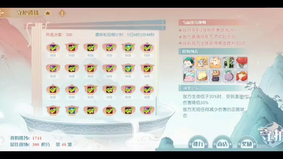 这是《食物语陪伴版》遗珠玩法的攻略,该玩法敌方受2技能伤害提升20%,作者达成了50波300分的成绩,具体攻略详情可查看评论区置顶内容。